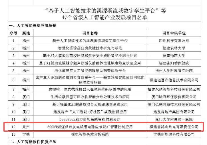 近日,福建省工業(yè)和信息化廳發(fā)布《關(guān)于公布“基于人工智能技術(shù)的溪源溪流域數(shù)字孿生平臺”等47個(gè)省級人工智能產(chǎn)業(yè)發(fā)展項(xiàng)目的通知》,公司自主申報(bào)的“600MW燃煤供熱發(fā)電機(jī)組電除塵節(jié)能AI智慧控制應(yīng)用”項(xiàng)目成功入選省級人工智能典型應(yīng)用場景,標(biāo)志著公司在人工智能與電力生產(chǎn)融合創(chuàng)新領(lǐng)域取得重要進(jìn)展。