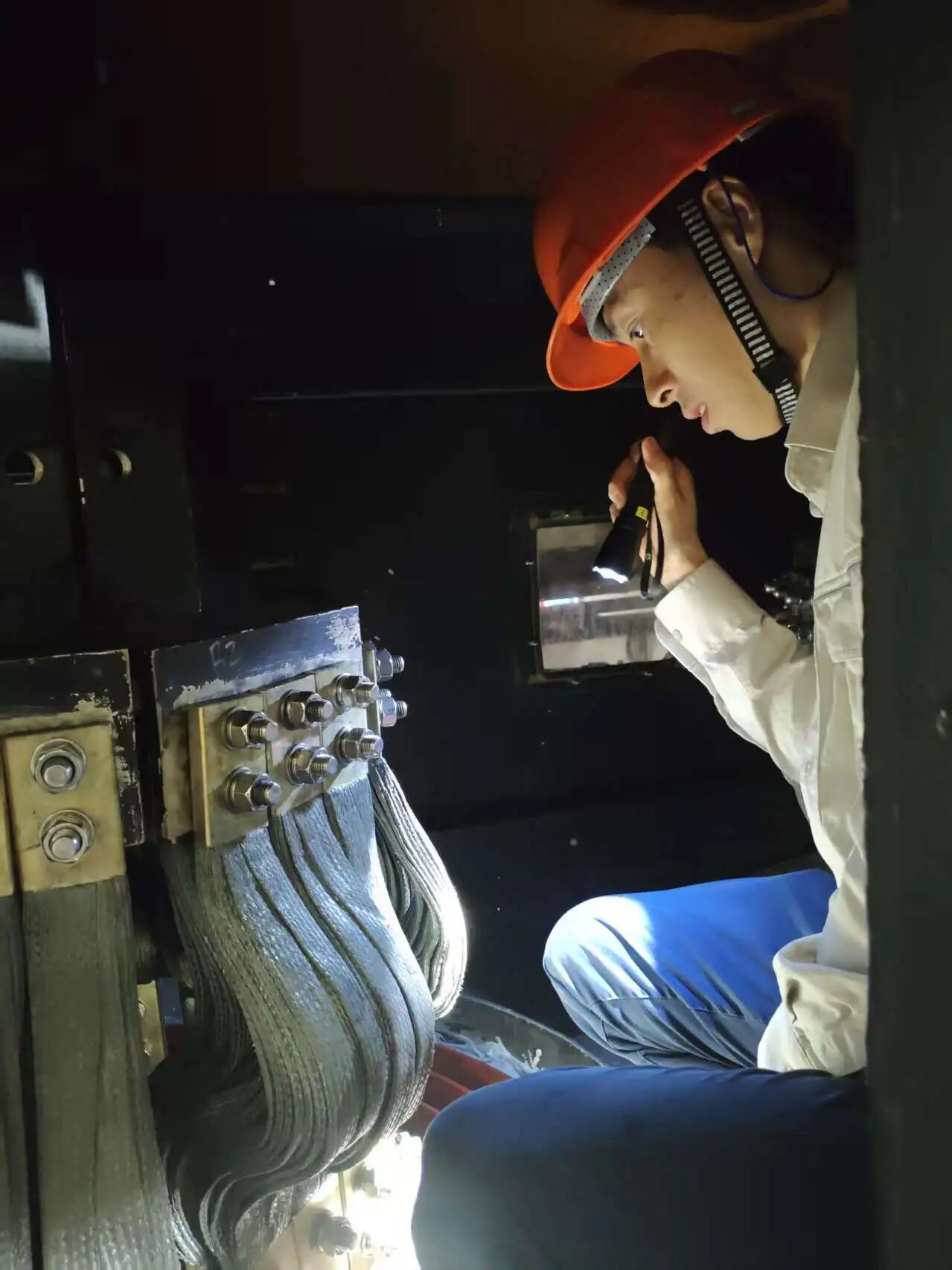 圖為公司電氣專業(yè)技術(shù)人員檢查電機(jī)出口軟連接
