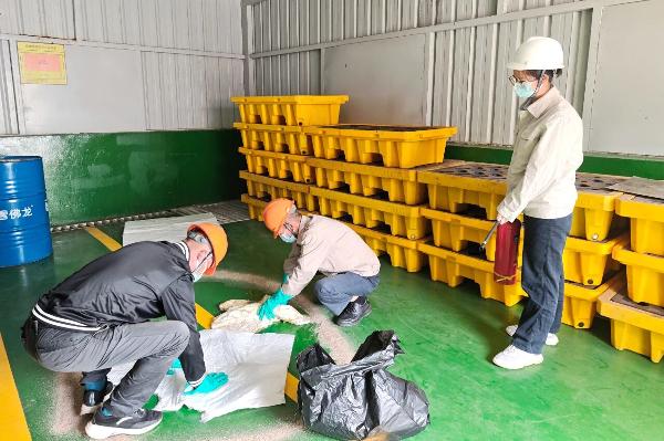 處置現(xiàn)場(chǎng)緊張有序、忙而不亂。救援人員首先精準(zhǔn)操作,將泄漏油桶快速扶正,從源頭切斷污染源;緊接著,吸油氈、沙土等應(yīng)急物資被迅速調(diào)配到位,對(duì)地面油污進(jìn)行有效圍堵與吸附,吸油泵同步作業(yè)回收泄漏廢油。整個(gè)處置過(guò)程環(huán)環(huán)相扣,各環(huán)節(jié)銜接流暢、協(xié)同高效。在全體參演人員的緊密配合下,泄漏物被徹底清理并安全回收,模擬險(xiǎn)情在最短時(shí)間內(nèi)得到有效控制,演練取得圓滿成功。