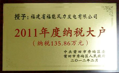 2012年2月,秀嶼區(qū)委區(qū)政府授予福能風(fēng)電公司2011年度納稅大戶稱號(hào)